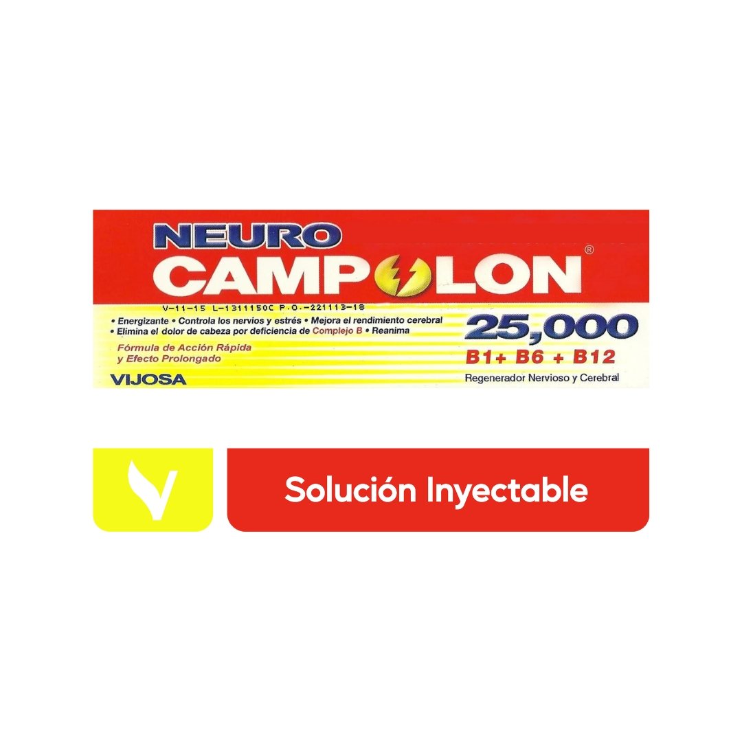 NEURO CAMPOLON Combina en su fórmula dos formas de vitamina B12: Cianocobalamina, de acción inmediata e hidroxocobalamina de acción prolongada la cual se deposita en el cuerpo y se libera poco a poco reteniéndose altos niveles en las proteínas de la sangre, prolongando por más tiempo los efectos deseados