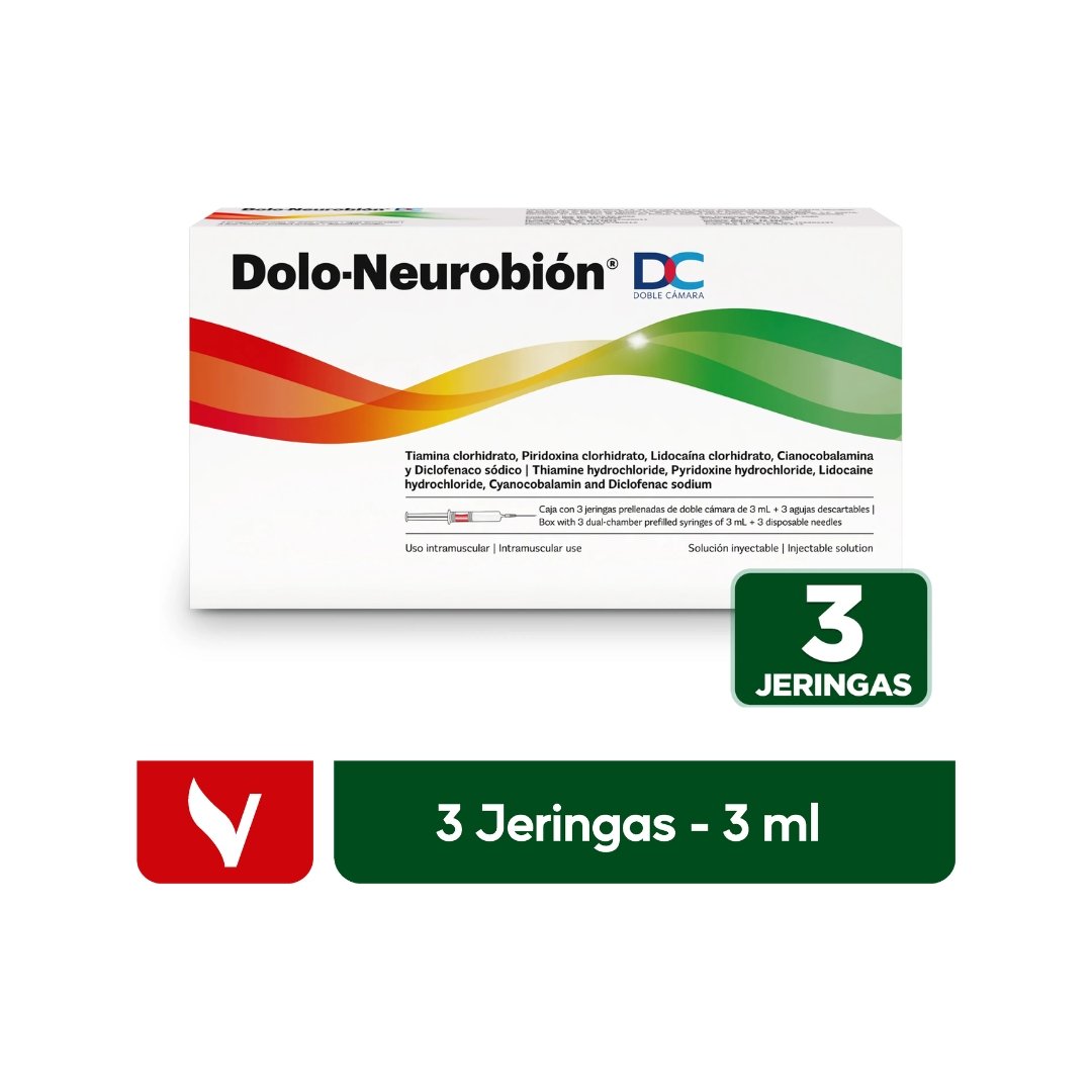 Presentación:Dolo-Neurobión® DC: Caja con 3 jeringas prellenada de doble cámara con 3 mL de solución