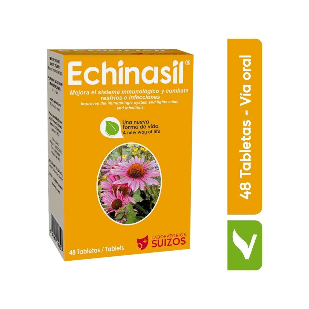 Echinasil está formulado a base de Echinacea, sustancia natural que mejora y aumenta la capacidad defensiva del sistema inmunológico, reduce la derivación de las infecciones y catarros, disminuyendo los síntomas de los mismos.